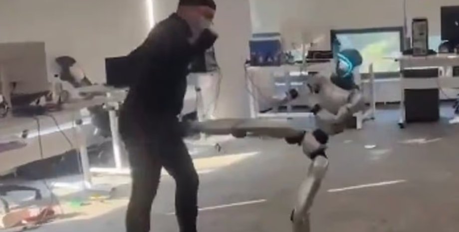 Скриншот видео В соцсети попало забавное видео, на котором инженер, тестирующий человекоподобного…